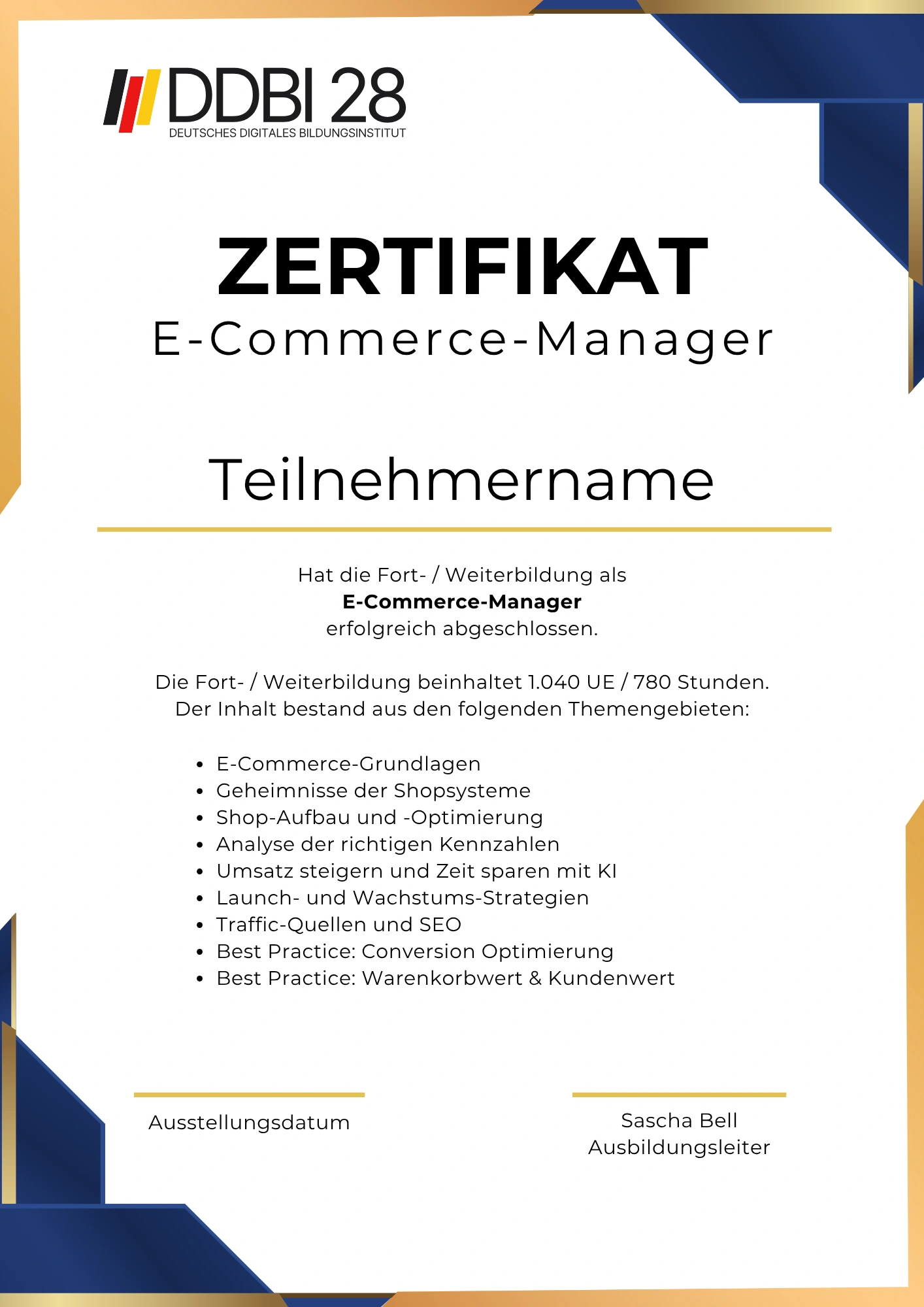 In der E-Commerce-Manager Weiterbildung lernen Ihre Mitarbeitenden, wie moderne Online-Shops strategisch aufgebaut, optimiert und automatisiert werden. Sie erfahren, wie Systeme wie Shopify, gezielte SEO-Maßnahmen, Conversion-Optimierung und KI-gestützte Prozesse zusammenwirken, um Umsatz, Effizienz und Sichtbarkeit messbar zu steigern. Nach der Weiterbildung kann Ihr Team den gesamten E-Commerce-Bereich datenbasiert steuern, Prozesse automatisieren und Online-Shops gezielt skalieren, statt nur zu verwalten.